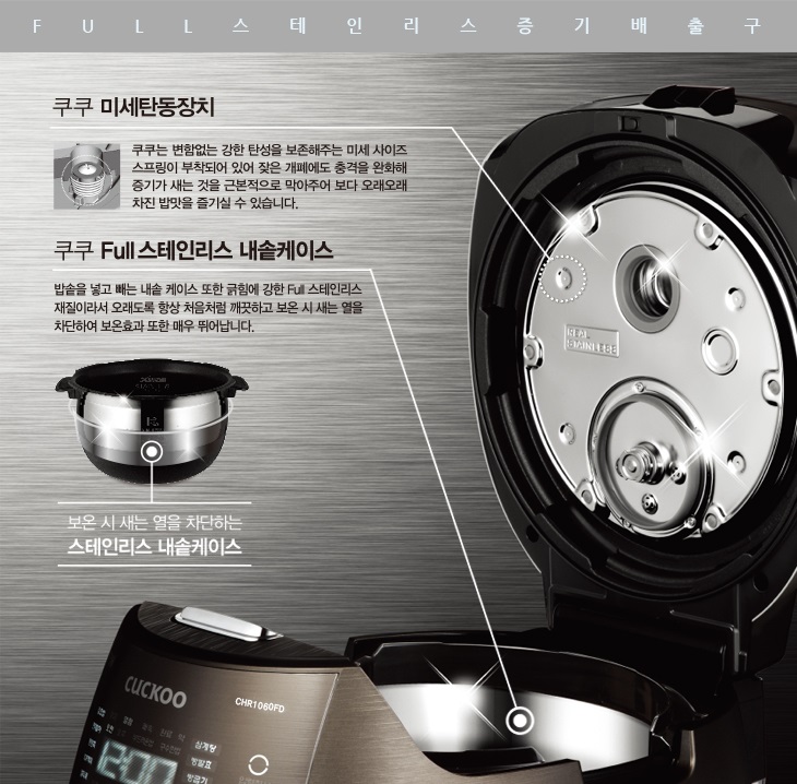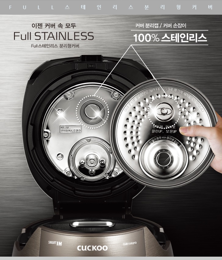 - Cuckoo không chỉ cái tiến nắp nồi cơm và phần nồi cơm bên trong mà còn tất cả bên ngoài bằng chất liệu Full Stainless mới mẻ và tiến hóa, chế độ nấu cơm bằng hơi áp suất giúp nồi cơm Cuckoo giữ gìn nguyên vẹn hương vị cơm với mong muốn đảm bảo an toàn cho sức khỏe và gia đình bạn.