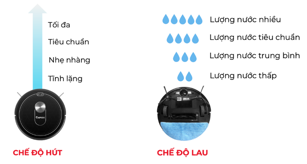 Robot có 4 chế độ lau, 4 chế độ hút hỗ trợ chủ nhà dọn dẹp nhà cửa tốt hơn.